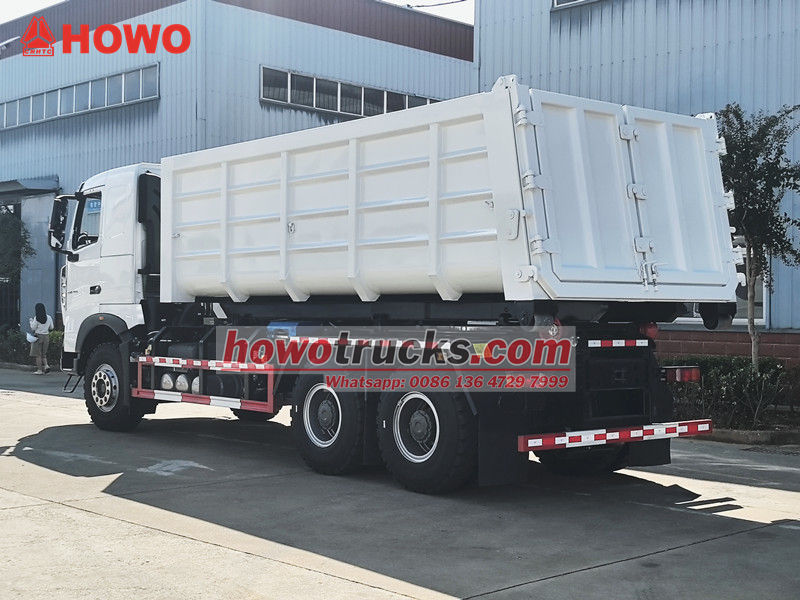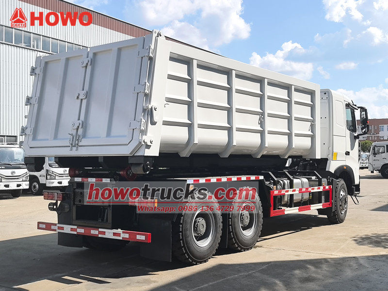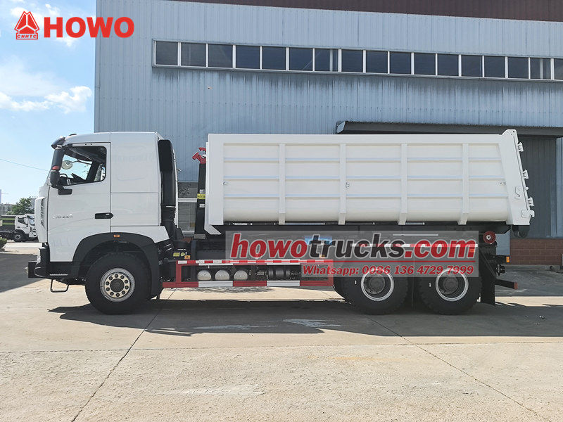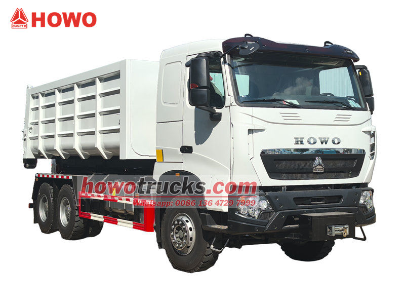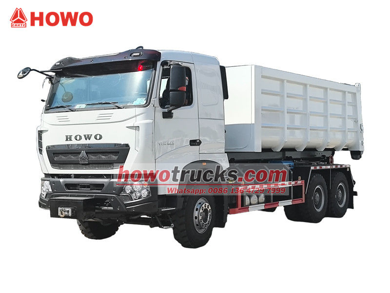 O caminhão basculante HOWO de 20 toneladas com gancho é um veículo altamente eficiente e confiável, projetado para a gestão de resíduos urbanos e suburbanos. Possui distância entre eixos de 4325+1350 mm, motor diesel MC11.44-50 de 440 hp e emissões de 10,518 L/min. Transmissão HW19710 com 10 marchas à frente e 2 à ré, pneus 12.00R20 (11 unidades), ar-condicionado, entrada USB, assistente de direção e 3 assentos. A carroceria e o chassi adotam uma estrutura separada. Através do dispositivo hidráulico de gancho na traseira do veículo, é possível engatar e transportar rapidamente contêineres de lixo padrão, possibilitando um modo de operação de circulação de "um veículo, vários contêineres".