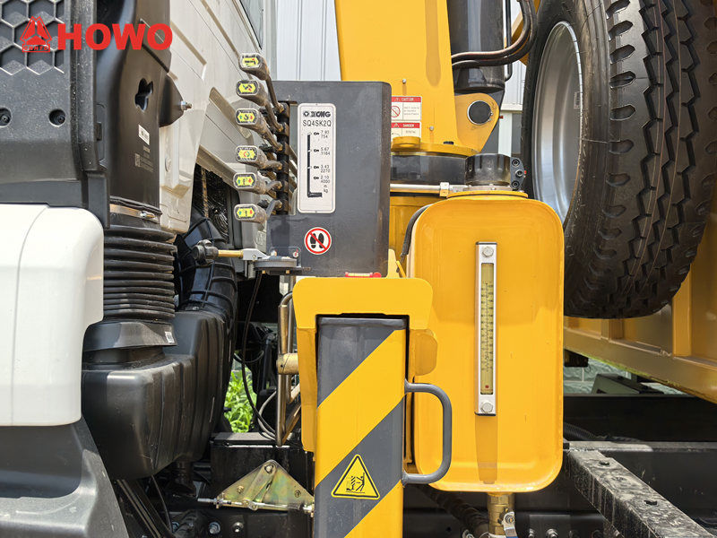 O caminhão Howo com guindaste de 4 toneladas possui um guindaste telescópico com grande alcance e amplo raio de operação, facilitando o içamento de diversos objetos pesados. Seu sistema hidráulico integrado proporciona operação flexível, alta capacidade de carga e eficiência de elevação. O caminhão também conta com função basculante para descarregamento rápido de materiais, economizando tempo e esforço.