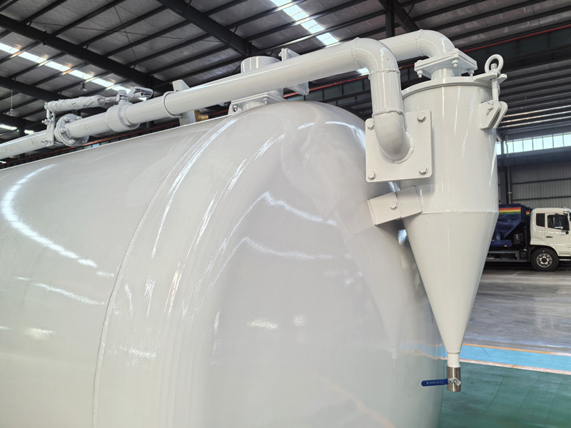 A bomba de vácuo gera pressão negativa, aspirando águas residuais, lodo e outros contaminantes para um tanque de águas residuais selado através de uma mangueira de sucção. O tanque está equipado com um dispositivo de prevenção de transbordamento para evitar o refluxo das águas residuais. kit de carroceria para caminhão-tanque de limpeza de drenagem Está equipado com um indicador de nível e um manômetro para garantir uma operação eficiente e segura.