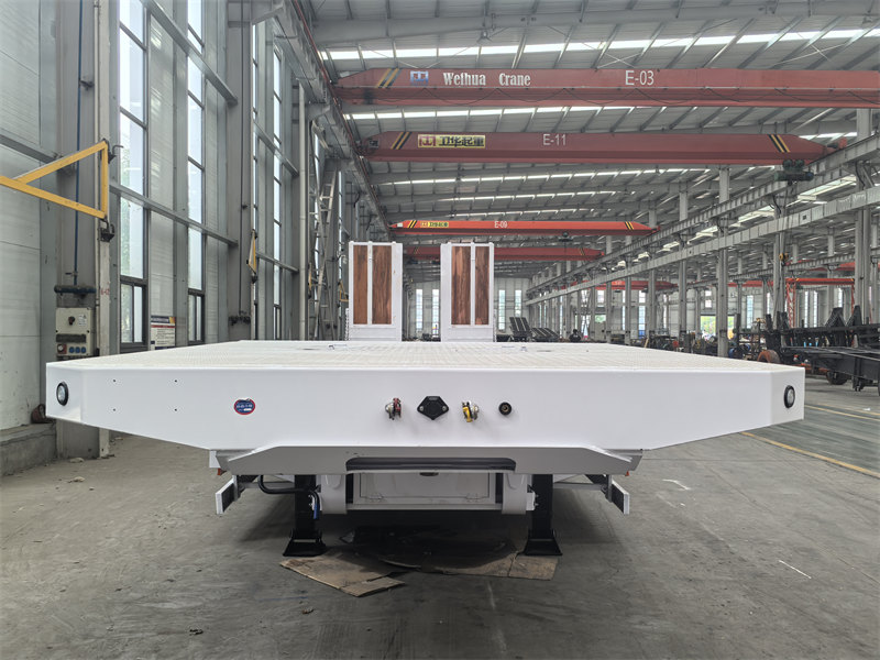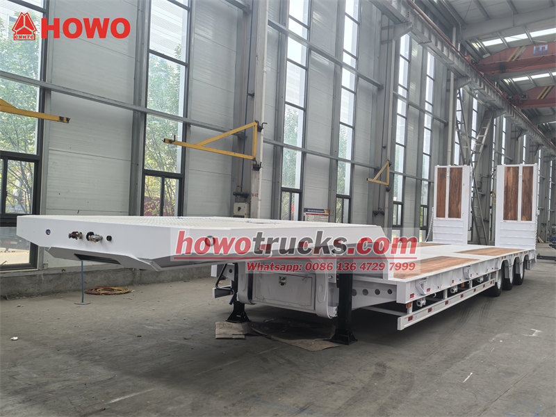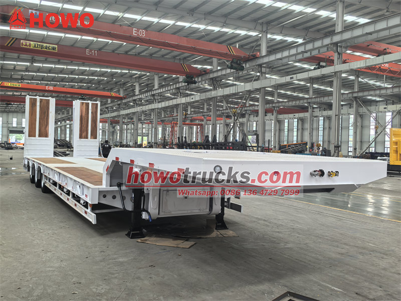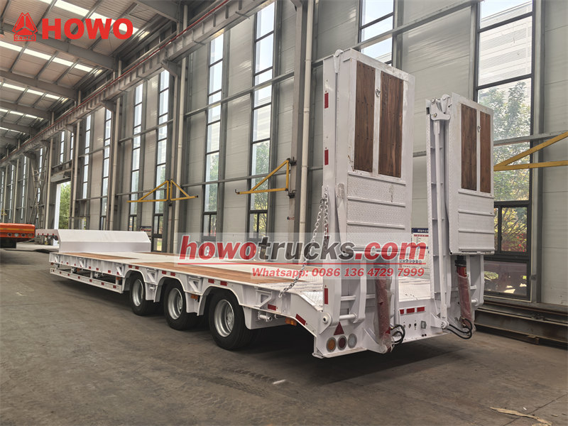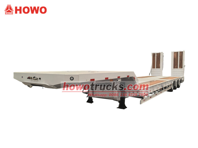 O reboque plataforma baixa de 45 toneladas e 3 eixos é um veículo projetado especificamente para o transporte de máquinas e equipamentos de grande porte. Ele é equipado com um engate de quinta roda JOST de 50 libras e um sistema de suspensão a ar com dispositivo de elevação do eixo dianteiro, além de três eixos autodirecionais de 13 toneladas. O reboque possui um sistema de freios WABCO EBS para garantir a segurança na condução. As rampas hidráulicas e a plataforma, com design especial, são revestidas com piso de madeira específico, proporcionando excelente proteção antiderrapante. Comparado aos modelos convencionais, seus eixos autodirecionais reduzem efetivamente o desgaste dos pneus, enquanto a função de elevação da suspensão a ar melhora a capacidade de transposição de obstáculos sem carga. O piso de madeira ajuda a minimizar a resistência ao atrito e aprimora a eficiência de carga e descarga.