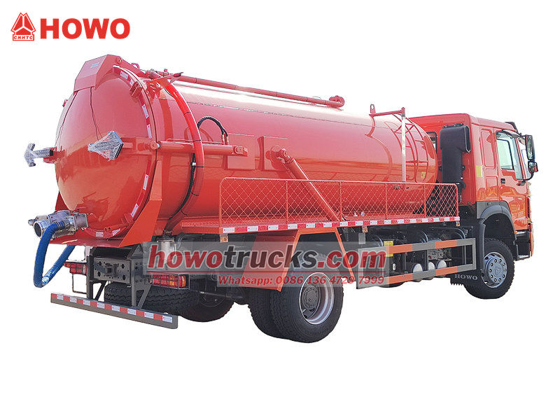 MORO or Jurop vacuum pumpO caminhão de sucção de esgoto Howo de 300 hp é um veículo de saneamento projetado especificamente para limpeza, sucção e transporte de esgoto, lodo, fezes e outras impurezas líquidas. Impulsionado por uma bomba de alto vácuo, ele oferece sucção potente e descarga eficiente de esgoto, permitindo a conclusão rápida das operações de sucção e descarga.