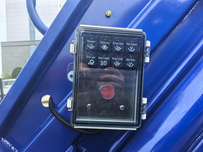 A caixa de controle operacional na cabine controla o empurrar e descarregar, além de selecionar o modo de operação (automático ou manual). Já a caixa de controle na parte traseira do veículo controla o mecanismo de prensagem e enchimento e o mecanismo de rotação do tambor. É muito prática e fácil de usar. Principalmente em aterros sanitários, os operadores podem realizar o descarregamento e o descarte de efluentes sem precisar sair do veículo. Dispositivos de controle remoto com fio podem ser instalados de acordo com as necessidades do usuário.