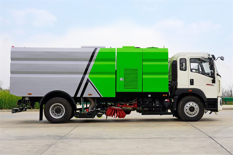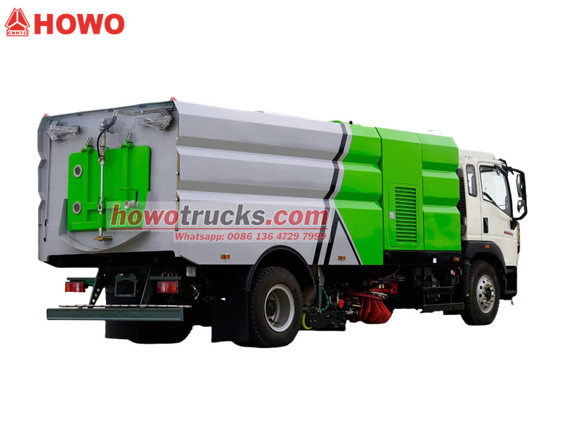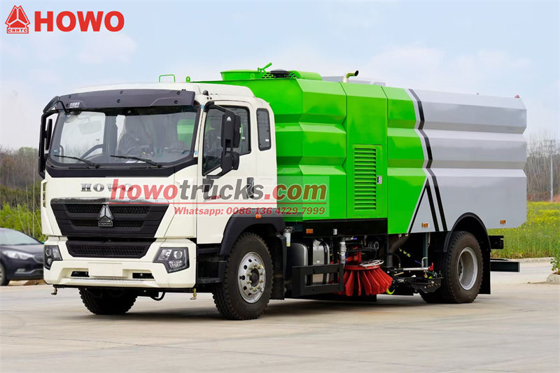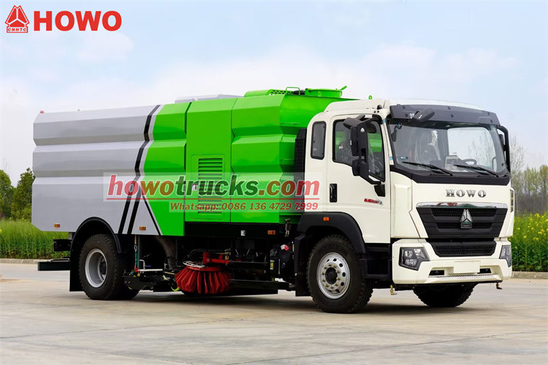 13000O Caminhão varredor Howo 4x2 É uma máquina com potente capacidade de varrição e operação eficiente, ideal para a limpeza de ruas urbanas, parques industriais e edifícios administrativos. Seu tanque de coleta de pó de 6 m³ e tanque de água de 4 m³, combinados com uma estrutura de varredora em aço inoxidável de 4 mm, garantem durabilidade e limpeza eficiente. Equipada com um motor a diesel de 300 HP e transmissão HW de 10 velocidades, proporciona uma operação potente e suave.