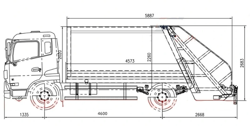 O caminhão de coleta de lixo Howo de 15 m³ com compactação traseira é equipado com um motor WP10.300E22 de 300 hp (6,8 L de cilindrada), oferecendo alto desempenho, além de ser econômico em termos de combustível e ecologicamente correto. O veículo possui 46A distância entre eixos de 00 mm, a transmissão HW13710 e os sete pneus 295/80R22.5 garantem uma condução estável e confiável. A cabine conta com ar-condicionado, porta USB, direção hidráulica e configuração de três assentos para uma operação confortável e prática. A caçamba tem um volume de 15 m³ e uma estrutura de basculamento traseiro para carga e descarga de lixo, permitindo três métodos diferentes de carregamento e descarregamento.