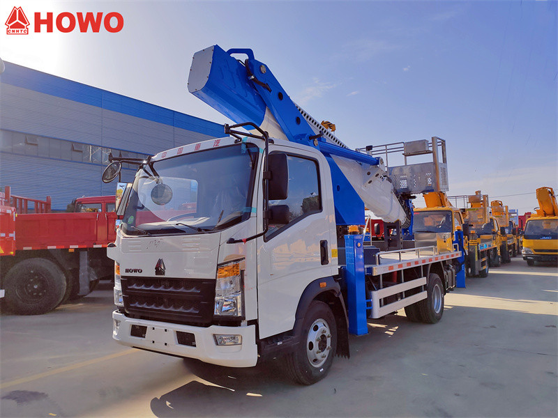 6500O Caminhão plataforma aérea HOWO de 18m É um caminhão especial de engenharia profissional que integra excelente desempenho técnico e design de segurança. Construído sobre o chassi leve Howo, o caminhão é equipado com um motor YN4102QBZL com potência máxima de 116 HPCom uma massa total de 7300 kg, o caminhão plataforma aérea leve Howo é flexível e potente. Possui altura máxima de trabalho de 18 metros e raio de ação máximo de 6 metros, e adota um sistema de balanceamento estático hidráulico para garantir a estabilidade.