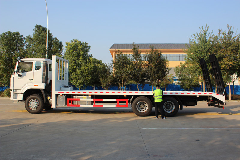 A superestrutura é a parte funcional central disto. Plataforma autocarregável HOWOA plataforma mede 8.600 × 2.500 mm e pode ser estendida hidraulicamente até uma largura de 3 metros. É fabricada com chapa de aço antiderrapante de 10 mm de espessura e aço de alta resistência, garantindo durabilidade e confiabilidade. O veículo também está equipado com uma perna de apoio telescópica hidráulica dianteira de 25 toneladas, um guincho hidráulico de 8 toneladas com cabo de aço de 20 metros de comprimento e 2 rampas hidráulicas, aumentando significativamente a estabilidade e a facilidade operacional de carga e descarga de equipamentos de grande porte. É amplamente utilizado em diversos canteiros de obras, áreas de mineração e locais de operação de máquinas de grande porte.