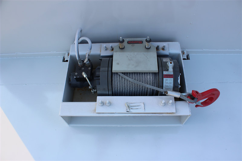 4. Carregamento e descarregamento autônomos eficientes: Possui um guincho hidráulico de 8 toneladas, uma rampa hidráulica de 2 metros e uma perna de apoio hidráulica frontal de 25 toneladas, permitindo o carregamento e descarregamento independente de equipamentos sem depender de máquinas adicionais.
