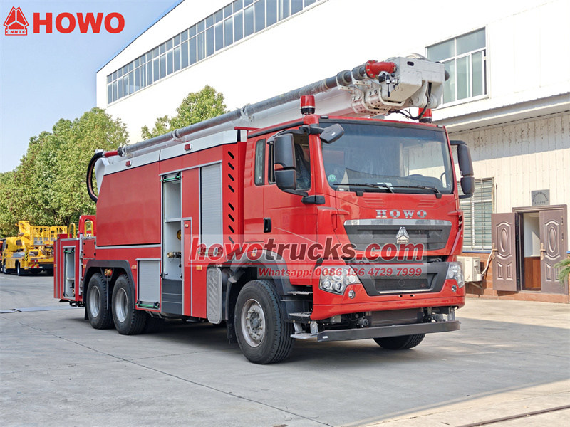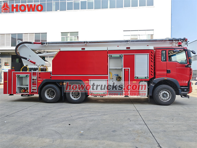 Howo 6x4 incêndio de longo alcance água O caminhão possui estrutura compacta, tamanho reduzido, grande capacidade de ajuste operacional, operação flexível e funções de resgate em altitudes elevadas e baixas, além de combate a incêndios. Adota o chassi Howo 6x4 para serviço pesado, com potência robusta e configuração avançada. A tomada de força (TDF) é a original do chassi, proporcionando a melhor relação potência/potência. O subchassi adota uma estrutura tubular de grande seção com boa resistência à torção, os estabilizadores laterais possuem uma estrutura em H de curto vão e os braços articulados permitem movimentos rápidos e suaves.