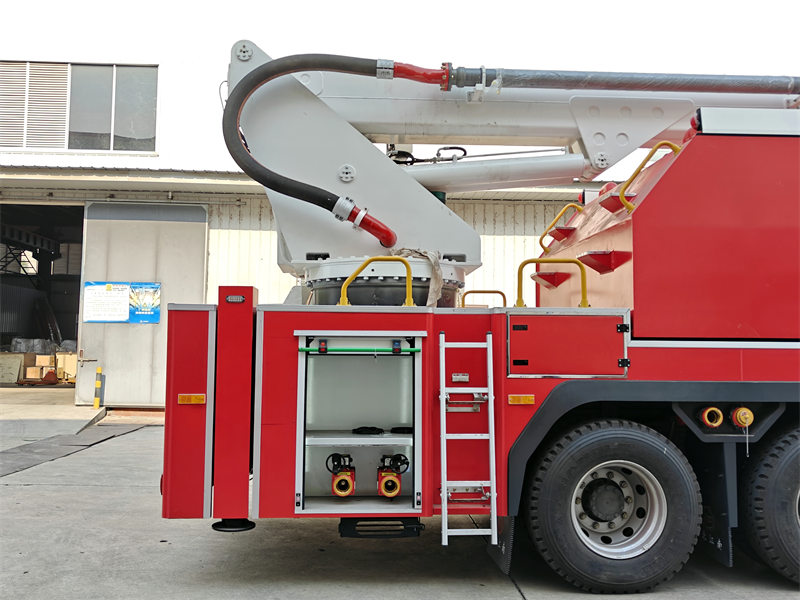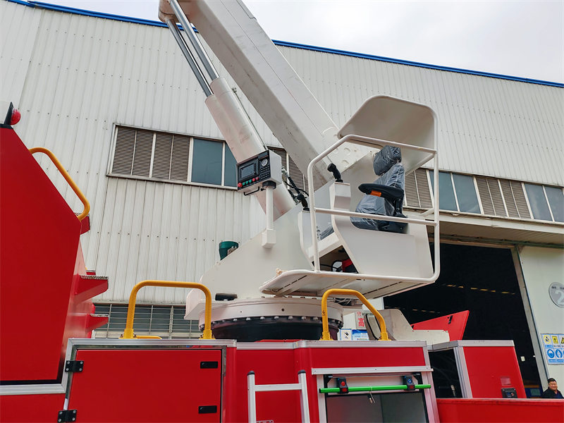 A parte giratória está equipada com uma junta giratória central que permite um ângulo de giro infinito de 360 graus. HO caminhão de bombeiros Owo, com torre extensível de longo alcance, possui bomba de incêndio de grande vazão e canhão de água. O tanque de água e o sistema de tubulação são fabricados em aço inoxidável de alta qualidade e tubos de liga de alumínio de alta resistência. O sistema hidráulico adota uma bomba de alto desempenho e um modo de controle proporcional hidráulico-elétrico. O sistema elétrico utiliza a tecnologia de comunicação CAN bus, consolidada e confiável, com operação centralizada em múltiplos pontos.