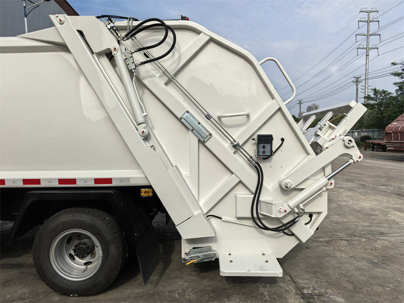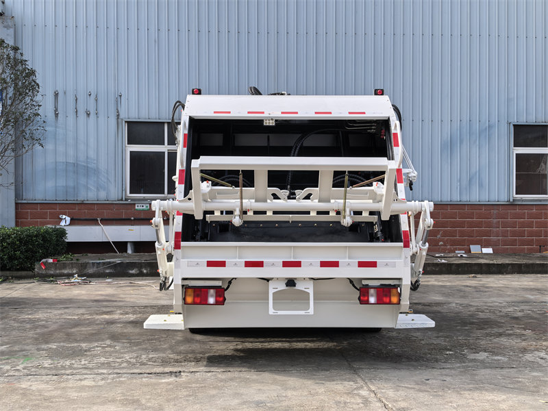 4. Mecanismo de Elevação da Caixa: A parte traseira está equipada com um mecanismo de elevação para manusear contentores de lixo de diferentes capacidades, permitindo o carregamento e descarregamento automáticos.