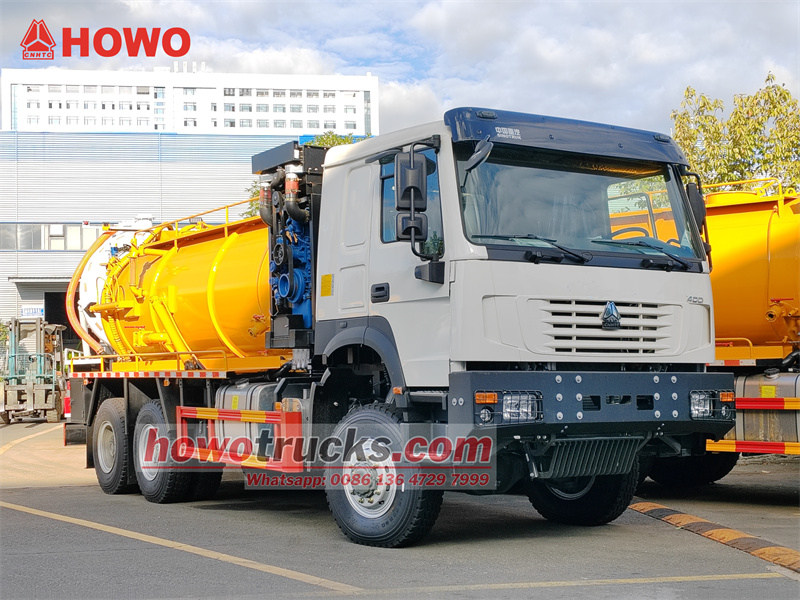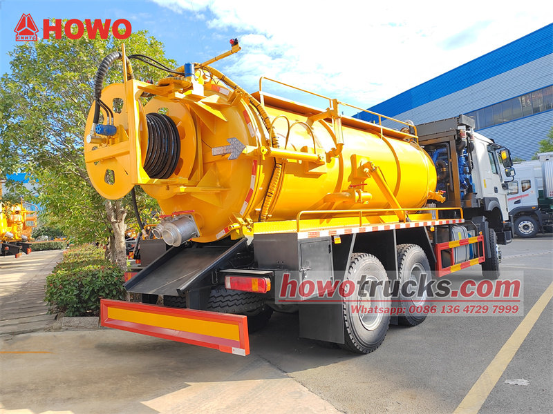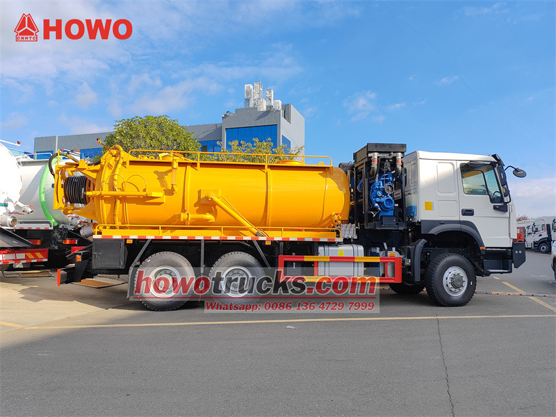 O veículo de dragagem combinado HOWO 6X6 de 12 m³ é uma modificação baseada no chassi Sinotruk HOWO 6x6 com tração nas quatro rodas. Possui cabine semi-estruturada, distância entre eixos de 4300 mm + 1400 mm e está equipado com um motor Weichai WP10H400E62 Euro 6 de 400 hp e uma transmissão HW19710 de 10 velocidades. O veículo conta com um tanque de águas residuais de 10 metros cúbicos e um tanque de água de limpeza de 2 metros cúbicos, cada um com compartimentos separados.