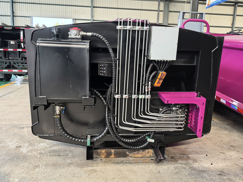 ♦A ação de compressão é suave e silenciosa, e possui uma função de reinicialização automática, garantindo uma operação confiável e contínua. A porta traseira do contêiner utiliza um sistema hidráulico de abertura e travamento para uma descarga rápida e completa, eliminando qualquer resíduo.