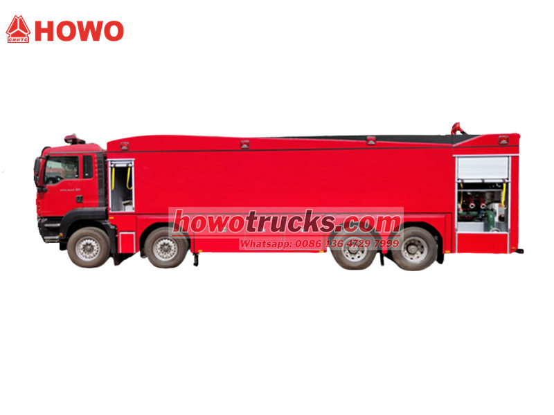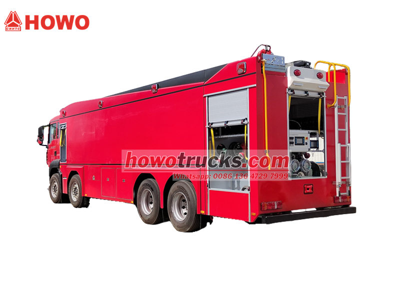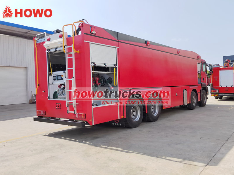 13000*2O Caminhão de espuma de incêndio Howo 8x4 Construído sobre o robusto chassi Howo TX 8x4, o veículo integra um excelente sistema de propulsão. O motor MC13.54-50, com 540 cavalos de potência, é capaz de enfrentar todos os tipos de terrenos difíceis, mesmo com sobrecarga. Está equipado com um tanque de água de grande capacidade (12.000 litros), um tanque de espuma (3.000 litros) e uma bomba de incêndio traseira de alta vazão (100 L/s) com alcance de até 65 metros.