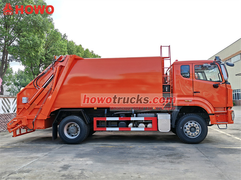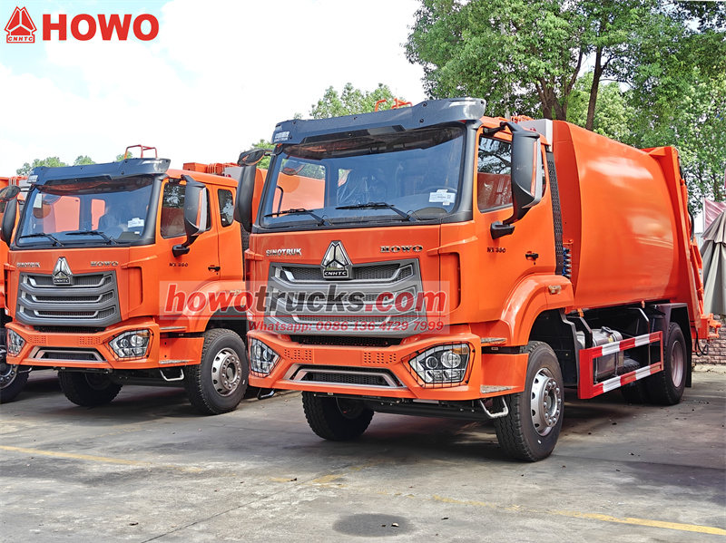 Caminhões compactadores de lixo HOWO de 15 m³ com carregamento traseiro, prontos para envio ao Oriente Médio.