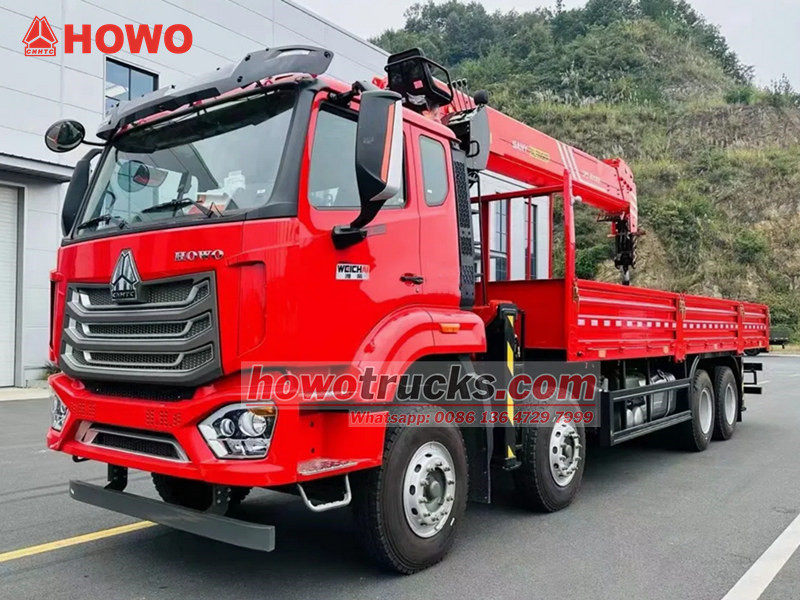XCMG crane, UNIC crane, knuckle boom crane is optionalO guindaste montado em caminhão HOWO NX 8×4 é um veículo multifuncional para serviços pesados que combina capacidades de elevação e transporte. Possui um guindaste Palfinger SPS40000 com capacidade máxima de elevação de 16 toneladas e torque de elevação de 40 toneladas-metro. A lança telescópica de cinco seções estende-se totalmente até 19 metros e, juntamente com sua função de rotação completa de 360 graus, permite operação flexível em diversos cenários de elevação. O chassi é baseado na série HOWO NX, movido por um motor diesel de 9,7 litros com potência de 273 kW, acoplado a uma transmissão de 10 velocidades e um sistema de freio a ar para garantir desempenho estável em condições de trabalho complexas.