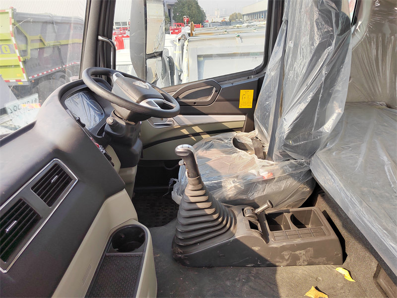Chassi SINOTRUK HOWO para serviço pesado com volante à direita, cabine HOWO NX com suspensão de quatro pontos, ar condicionado (aquecimento e resfriamento), banco com suspensão a ar, travamento central, vidros elétricos e chave com controle remoto.
