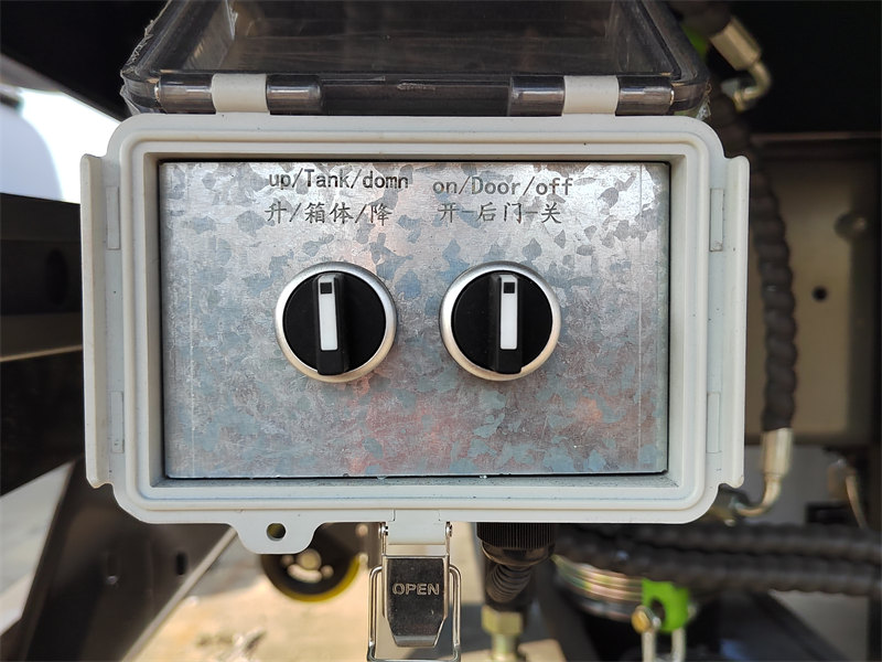 A porta traseira do tanque está equipada com um mecanismo de travamento hidráulico tipo pino. Este sistema permite a abertura, o fechamento e o travamento automáticos da porta com um único toque, garantindo uma vedação segura para evitar vazamentos de resíduos e esgoto.