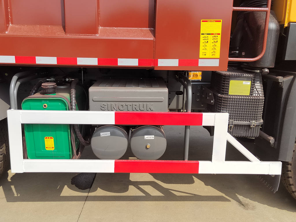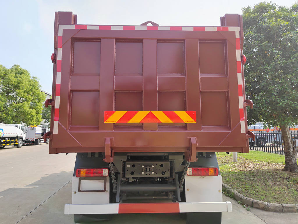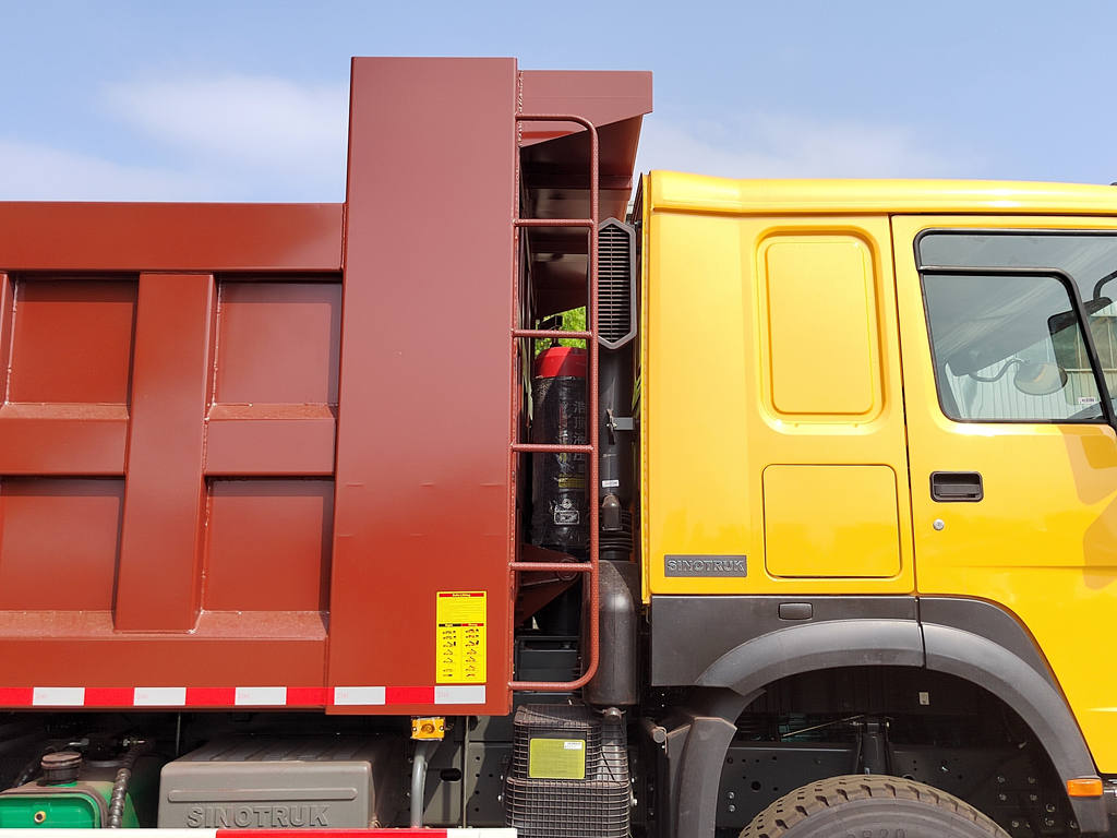O caminhão basculante de construção Howo consiste principalmente em um chassi, sistema de elevação hidráulica, caçamba e sistema de controle. A caçamba é soldada a partir de chapas de aço de alta resistência, articulada na parte frontal à estrutura, e a parte traseira pode ser aberta hidraulicamente ou possui um mecanismo de travamento automático para garantir uma vedação hermética durante o transporte. O sistema hidráulico compreende uma bomba de óleo, um cilindro hidráulico de múltiplos estágios, uma válvula de controle e um tanque de combustível. A elevação e o abaixamento da caçamba são controlados por um joystick dentro da cabine.