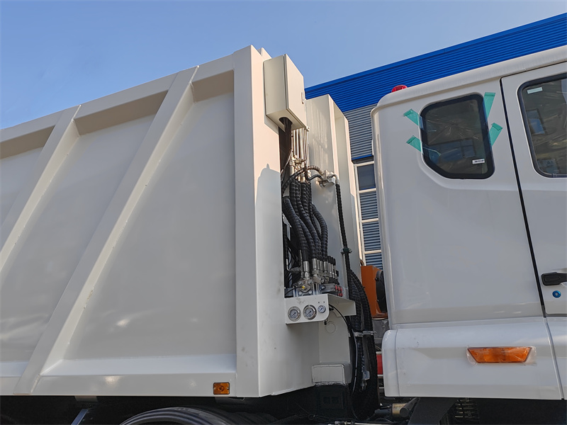 Recipiente para lixo: A estrutura superior apresenta um contêiner de resíduos compactados em forma de arco com capacidade para 30 metros cúbicos, feito de aço carbono de alta resistência, tratado com revestimento anticorrosivo e antiferrugem, com placas laterais de 5 mm de espessura e uma placa de fundo de 6 mm de espessura.
