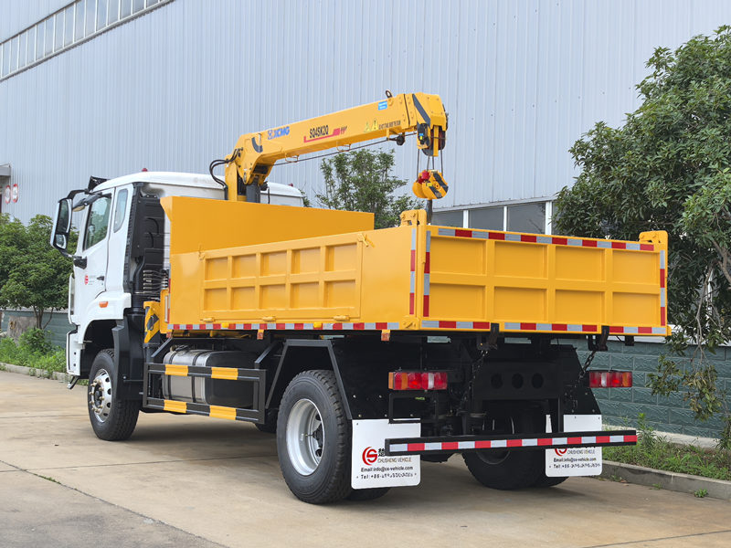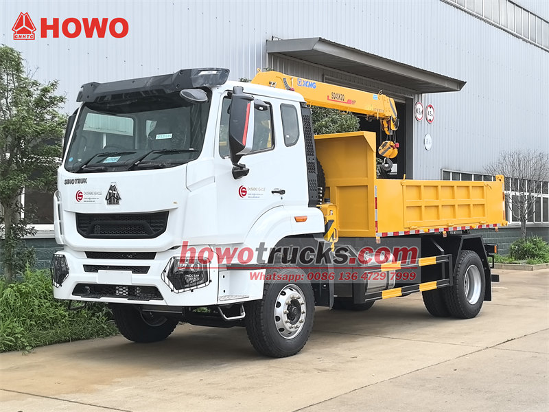 16000O caminhão basculante com guindaste SINOTRUK HOWO é um veículo de engenharia pesado multifuncional que combina capacidades de autodescarga e elevação. Ele consiste em quatro componentes principais: chassi reforçado SINOTRUK, guindaste telescópico de três seções XCMG SQ4SK2Q, sistema hidráulico e caçamba basculante. Equipado com um motor Weichai de 220 hp e transmissão manual de 10 velocidades, integra as funções de elevação e basculamento. Diferentemente dos guindastes convencionais montados em caminhões, ele incorpora de forma inovadora um sistema de elevação da caçamba, permitindo operações de elevação em um raio de trabalho de 8,1 metros, além de realizar a autodescarga do material.