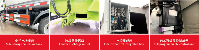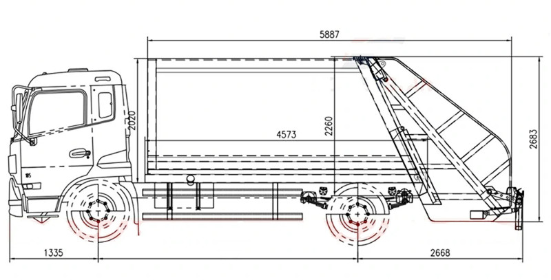 ●O veículo está equipado com um mecanismo de inclinação na traseira, que inclina automaticamente os contentores ou caçambas de lixo, enviando o lixo para a câmara de compactação. Empurradores hidráulicos comprimem o lixo várias vezes, reduzindo seu volume para cerca de um terço do tamanho original, aumentando significativamente a capacidade de carga.